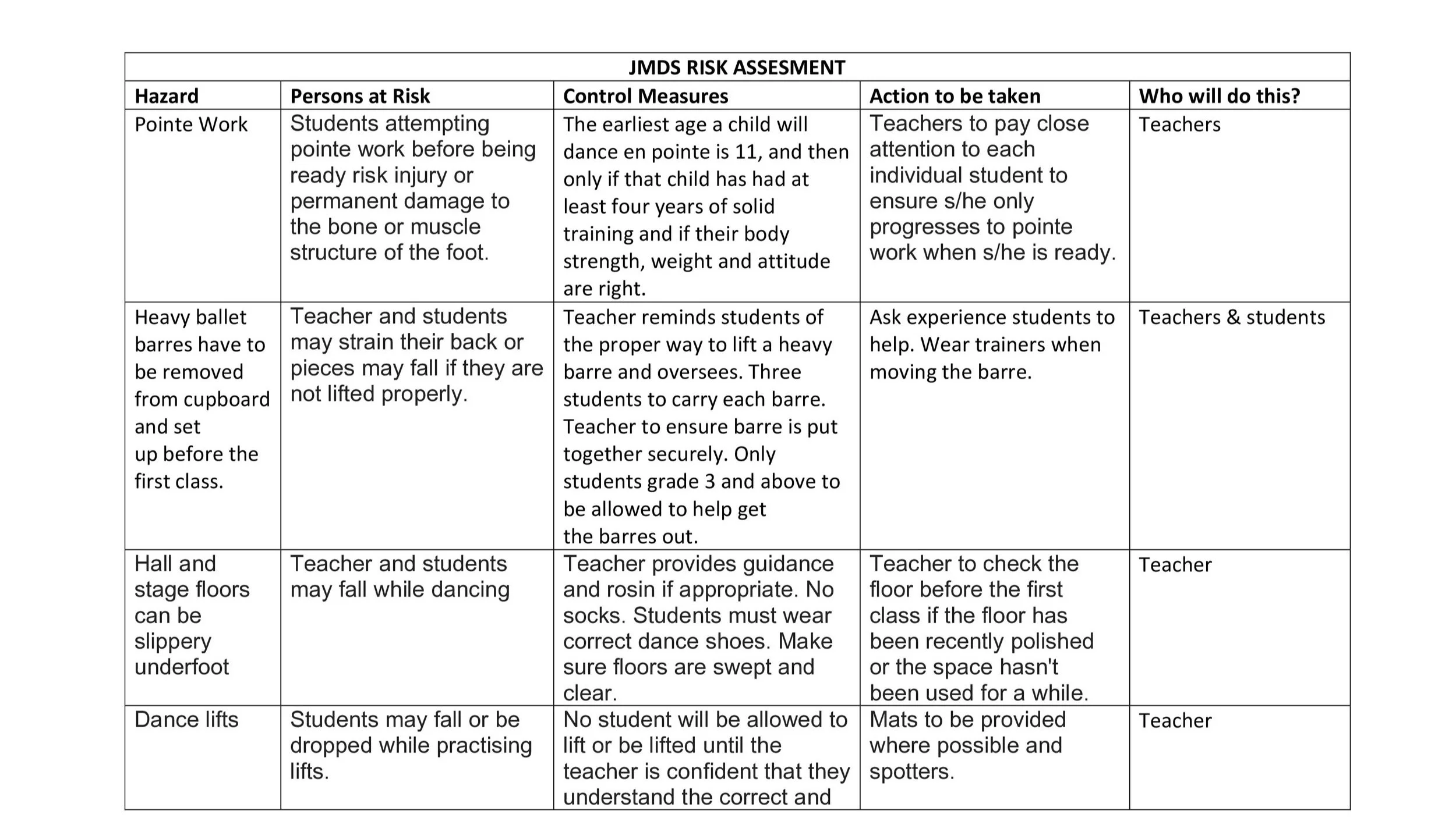 JMDS will undertake regular assessment of risks regarding premises hired and any concerns will be raised with the providers